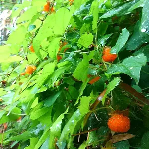名古屋帯 オレンジ系 葉と鳥と蝶の模様